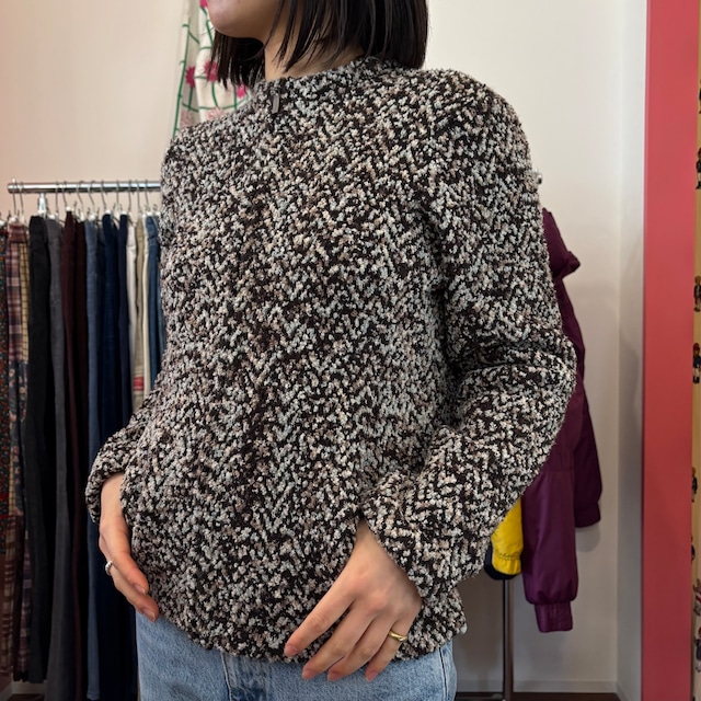 B: used並みの使用感 ※両袖リブにシミあり。 素材: アクリル100% サイズ: M 着丈62 身幅55 肩幅44 袖丈73 model 154cm