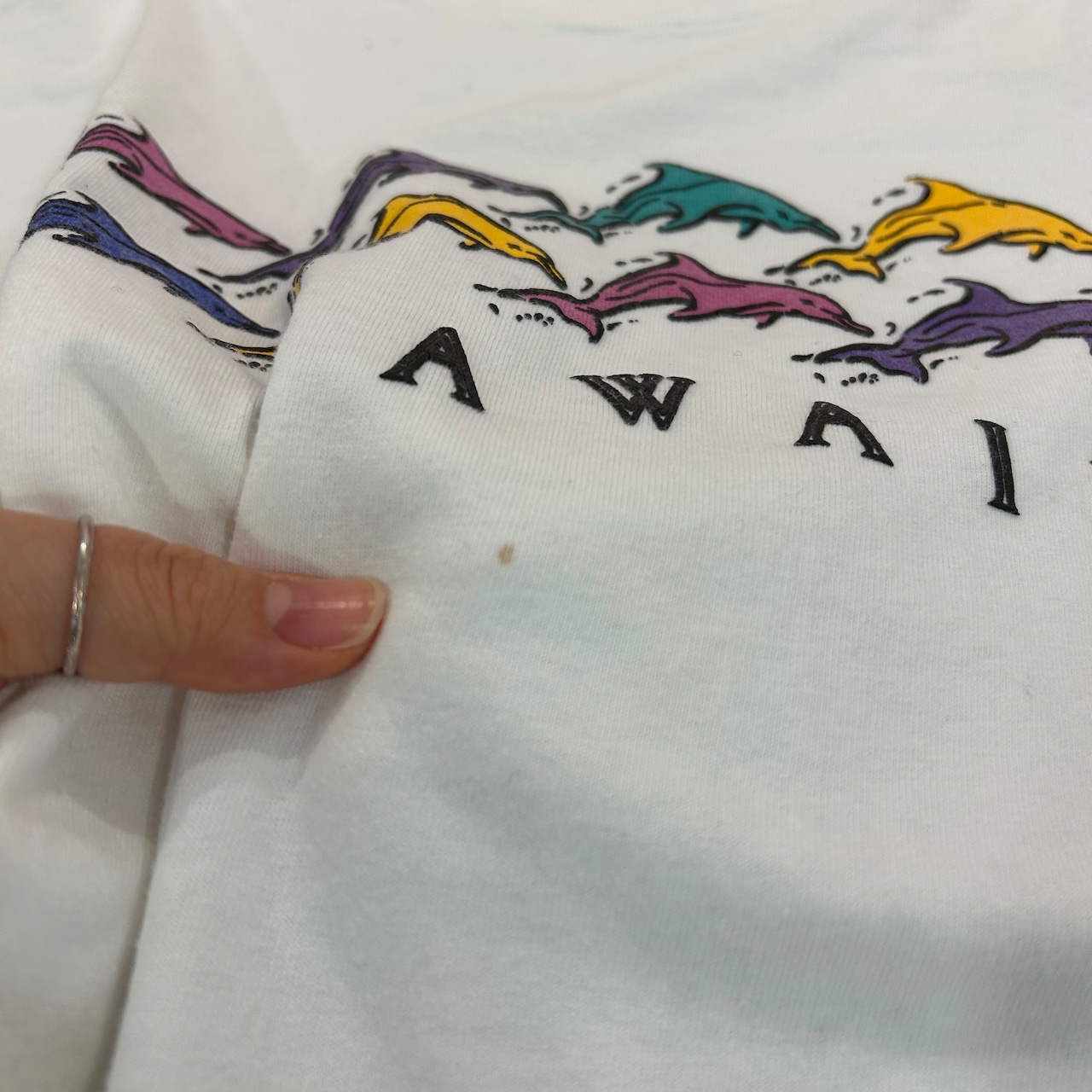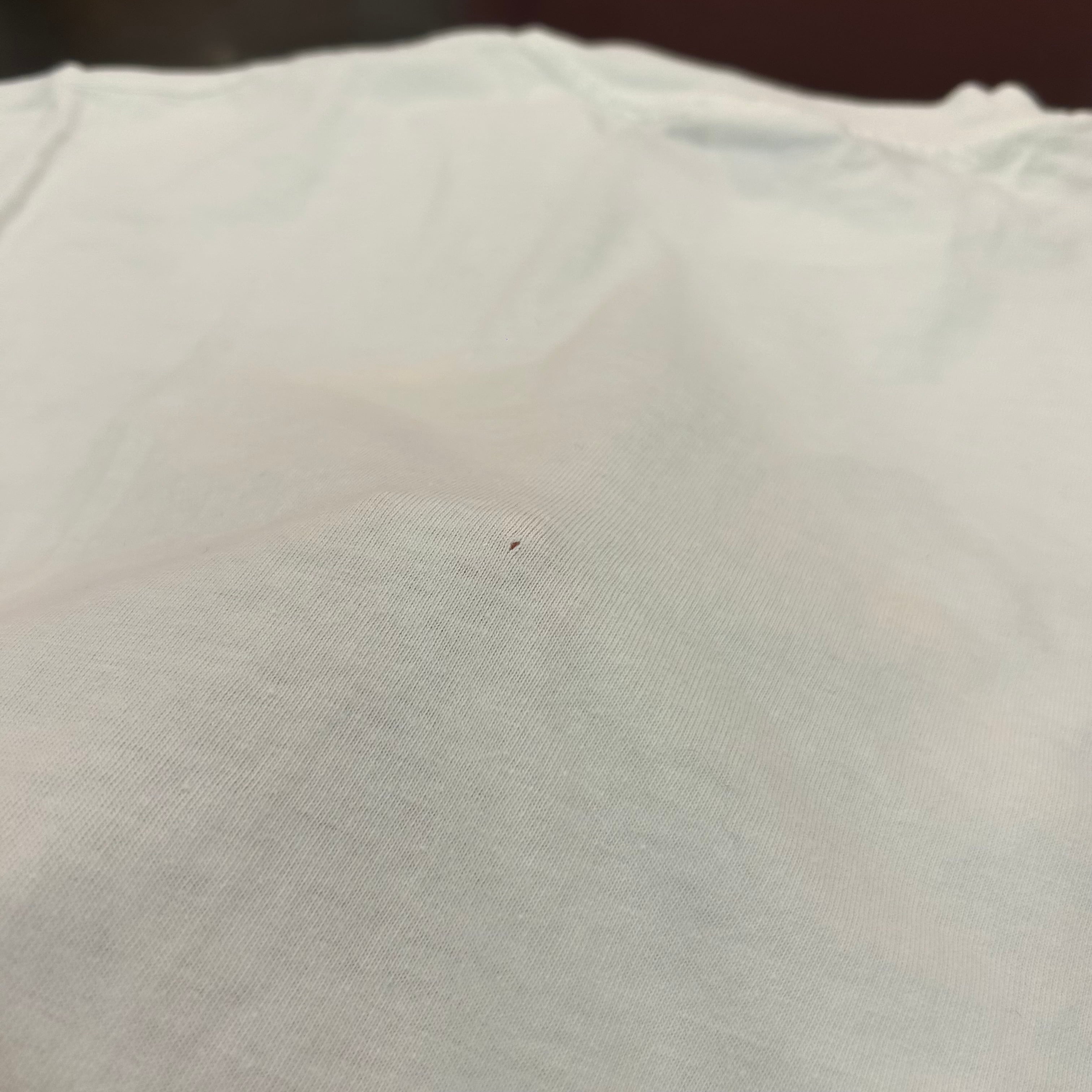 ※表面プリント下にシミあり。背面中央ピンホールあり。裾ヨレあり。
