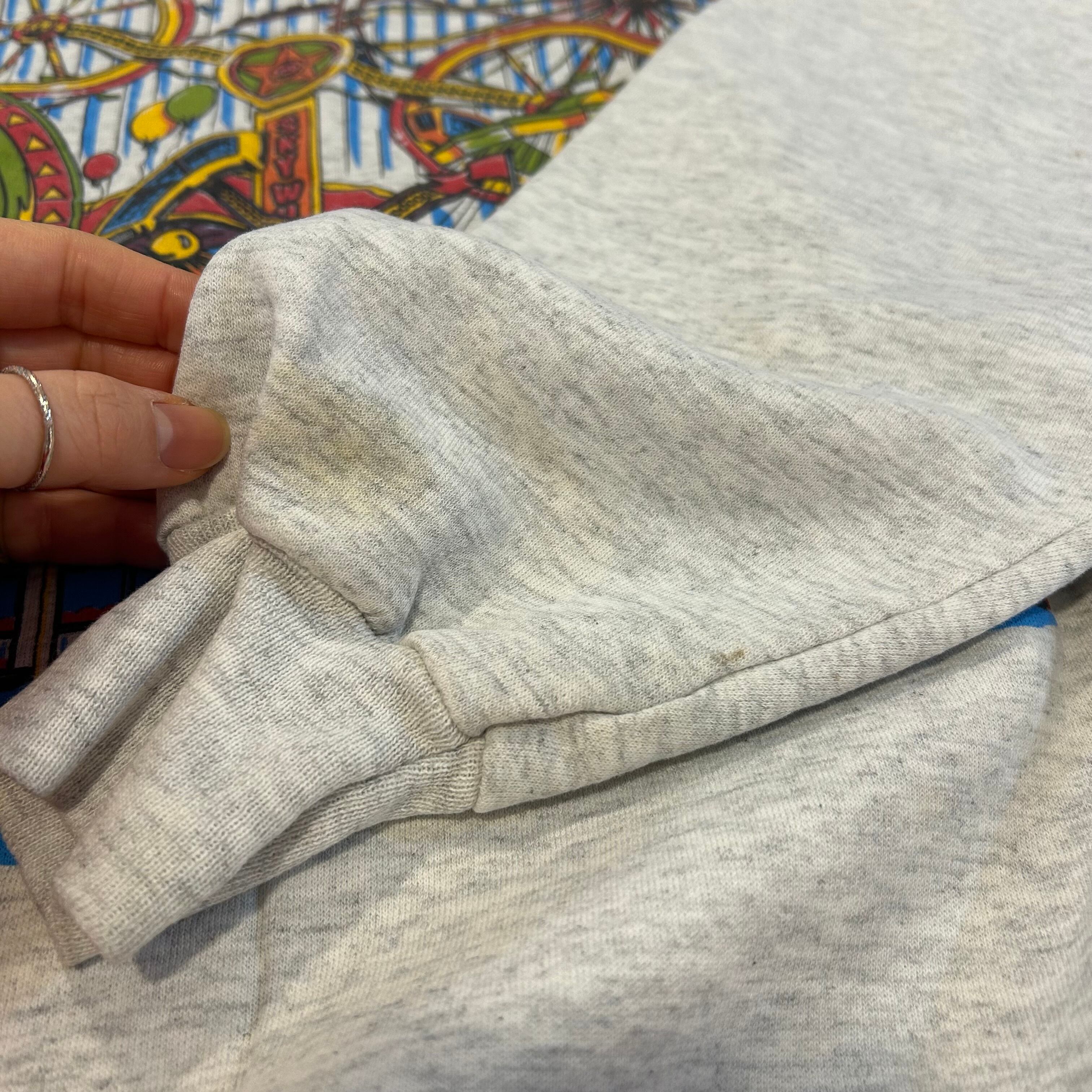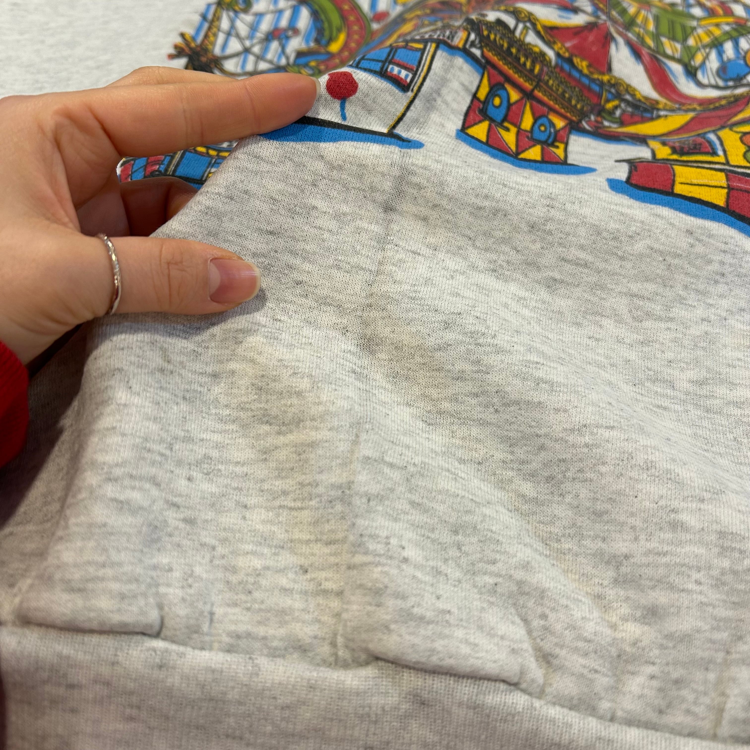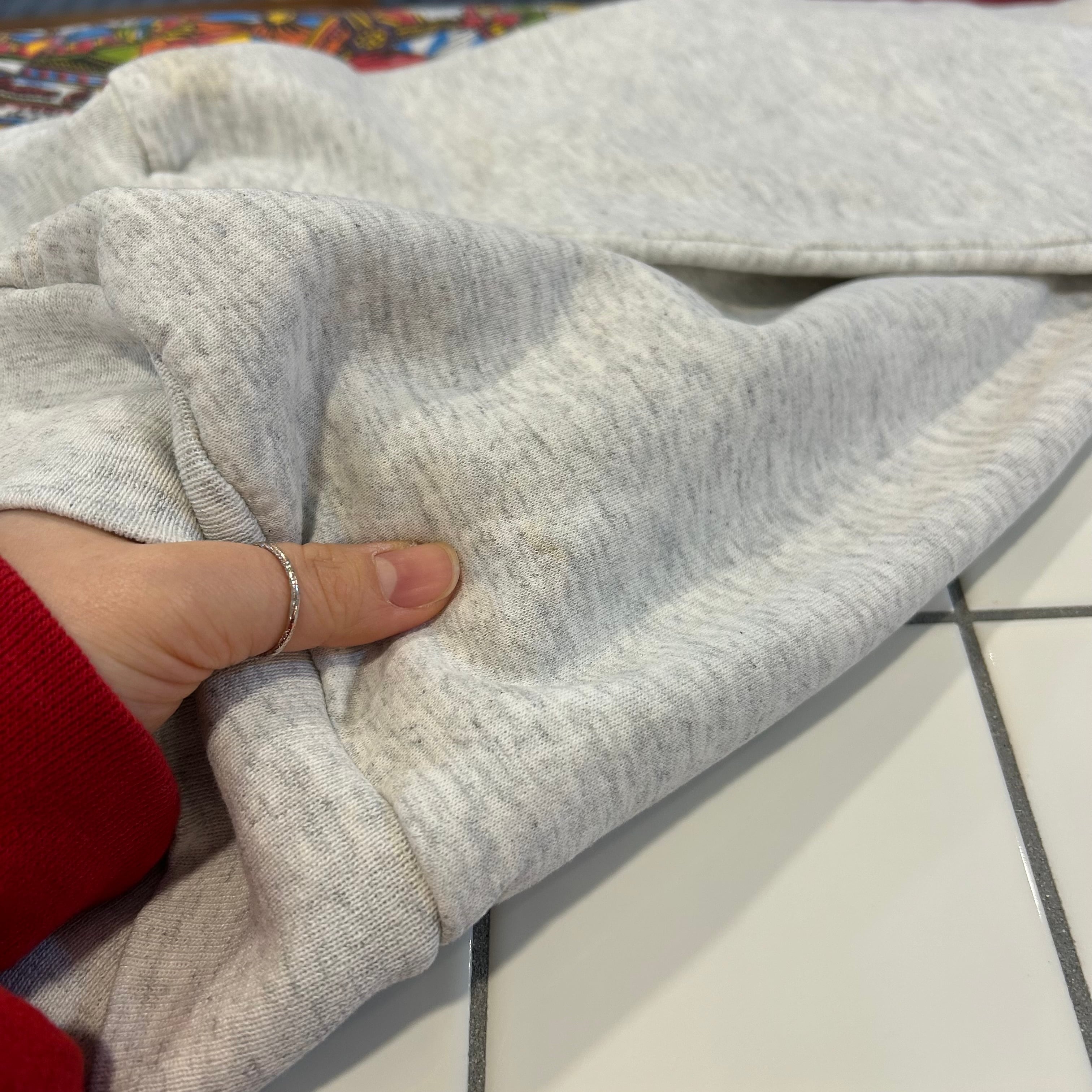 ※表面、裏面のセンターに生地のダメージあり。左腰、背面左袖裾にシミあり。